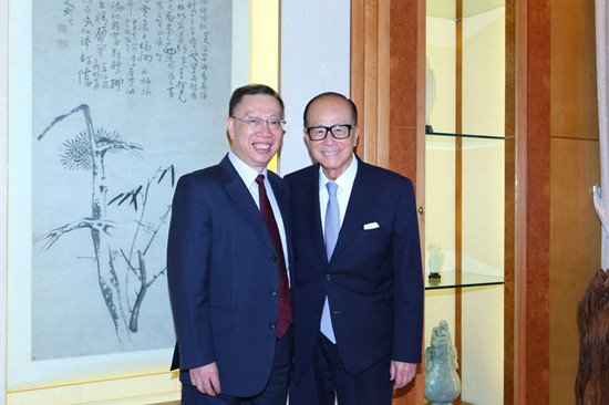 李嘉诚(右)前日与黄洁夫会面签署文件。 李嘉诚基金会提供